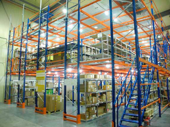 Мезонін є сталевою багатоповерховою конструкцією, яка дозволяє максимально використовувати висоту і площу складського приміщення. Ця стелажна конструкція може займати практично всю висоту приміщення, маючи до 5 рівнів. Кожен рівень обслуговується окремо, незалежно від інших. Завантаження та вивантаження товарів може здійснюватися як вручну, так і за допомогою вилкових навантажувачів, ліфтів та конвеєрів.