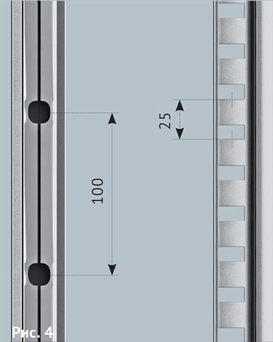 Профіль завдовжки від 1000 мм до 10 000 мм; маса: 1,25 кг/погонний метр. Растровий крок установки заввишки 25 мм. Конструкція збирається за допомогою кріплення стійок за допомогою сполучних пластин і, при необхідності, посилюється підсилювачем траверси. Такий спосіб збирання допомагає досягти високої міцності. |
